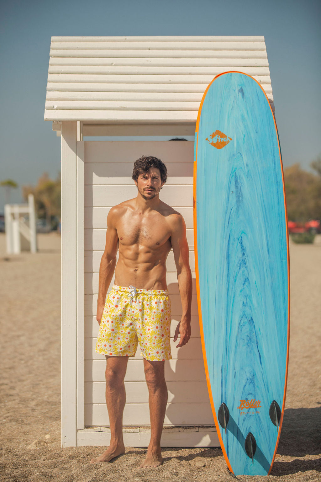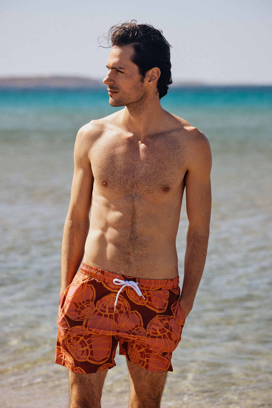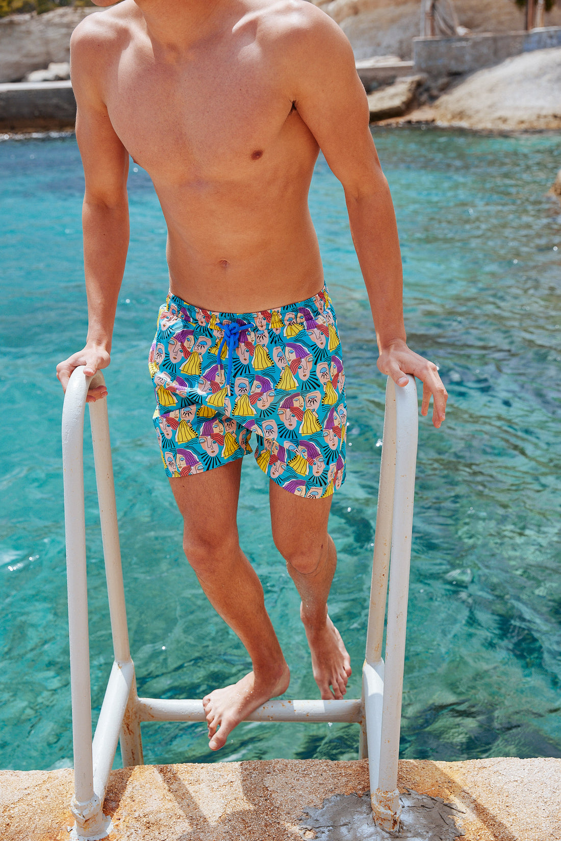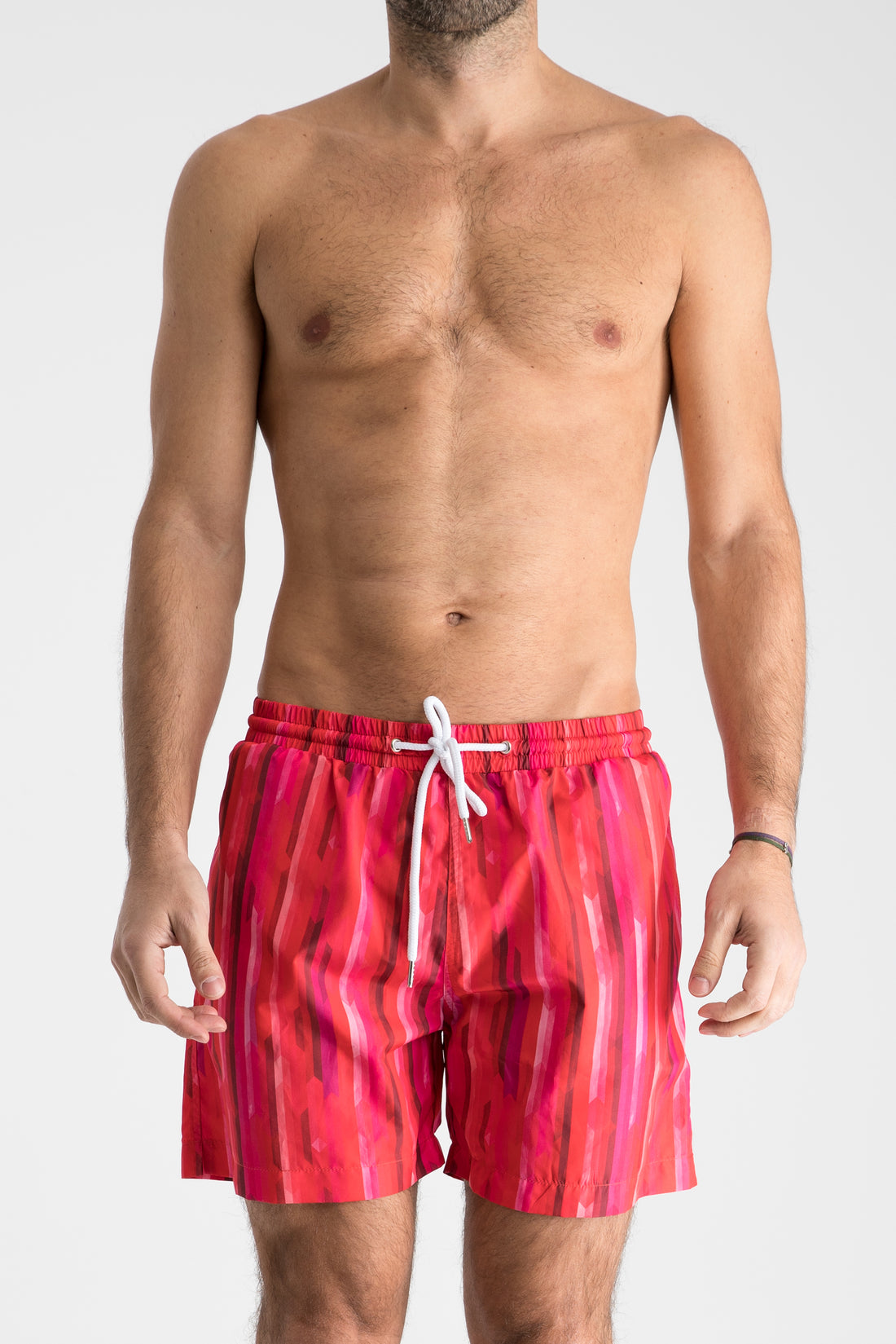 Printed classic swimwear shorts with elastic waistband and drawstring. Three pockets: one at each side,...