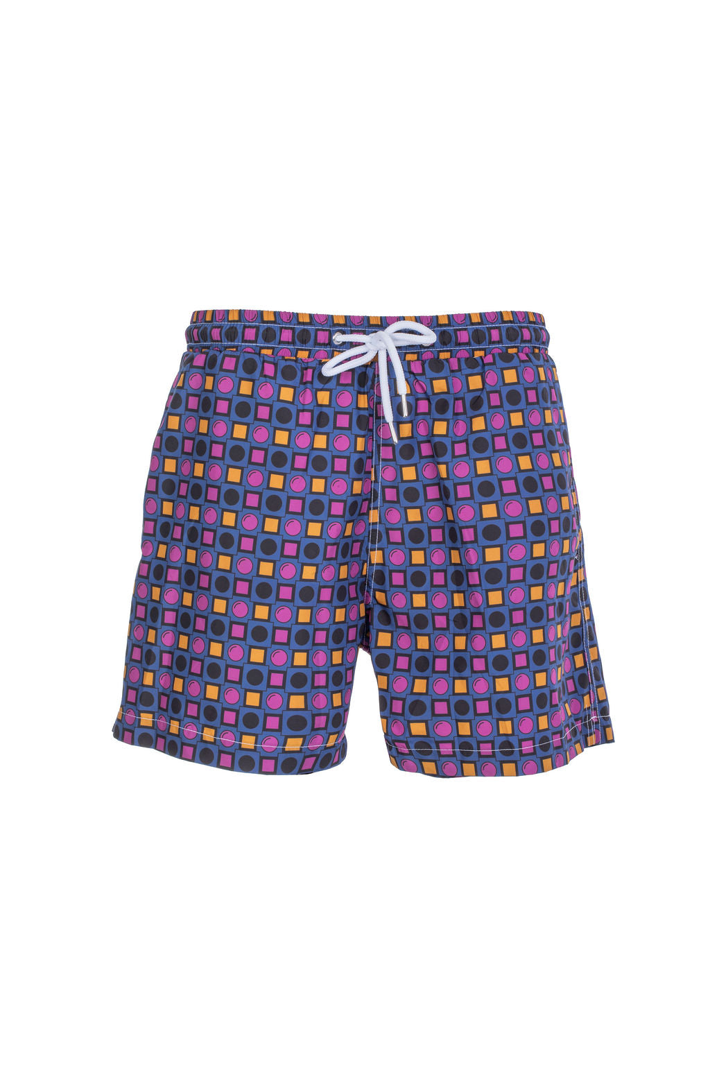 Classic swimwear shorts with elastic waistband and drawstring. Three pockets: one at each side, and...